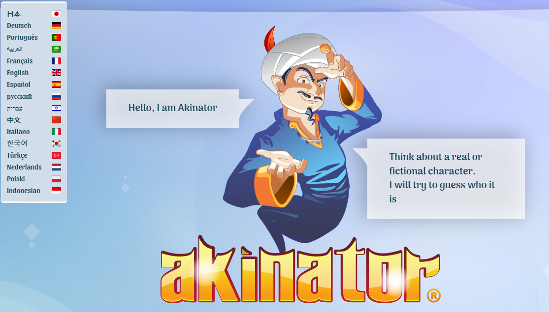 Rozehřívačka na začátek hodiny, skvělý domácí úkol, ale i parádní materiál do online lekce pro vysvětlování tvorby otázek. Džin, co uhádne všechno, na co myslíte, se nejmenuje Aladin, ale Akinator, a mluví hned 16 jazyky! Vyzkoušejte ho v tom svém a trénujte se svými studenty porozumění. Stačí kliknout ZDE.