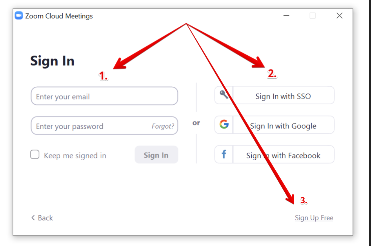 Abyste mohli používat Zoom, musíte se přihlásit. Pokud jste se již registrovali, zvolte si váš způsob přihlášení. Jestli registrování ještě nejste, tak v dolním pravém rohu je „Sign Up Free,” klikněte na to a registrujte se.